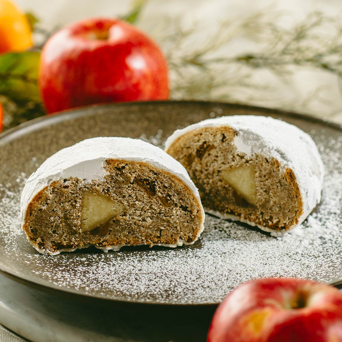 当店のシュトーレンは、自社栽培のオーガニック「やまびこ麦」と、干し柿、りんご、いちじくなどの和のフルーツを用い、東北の豊かさを表現しています。