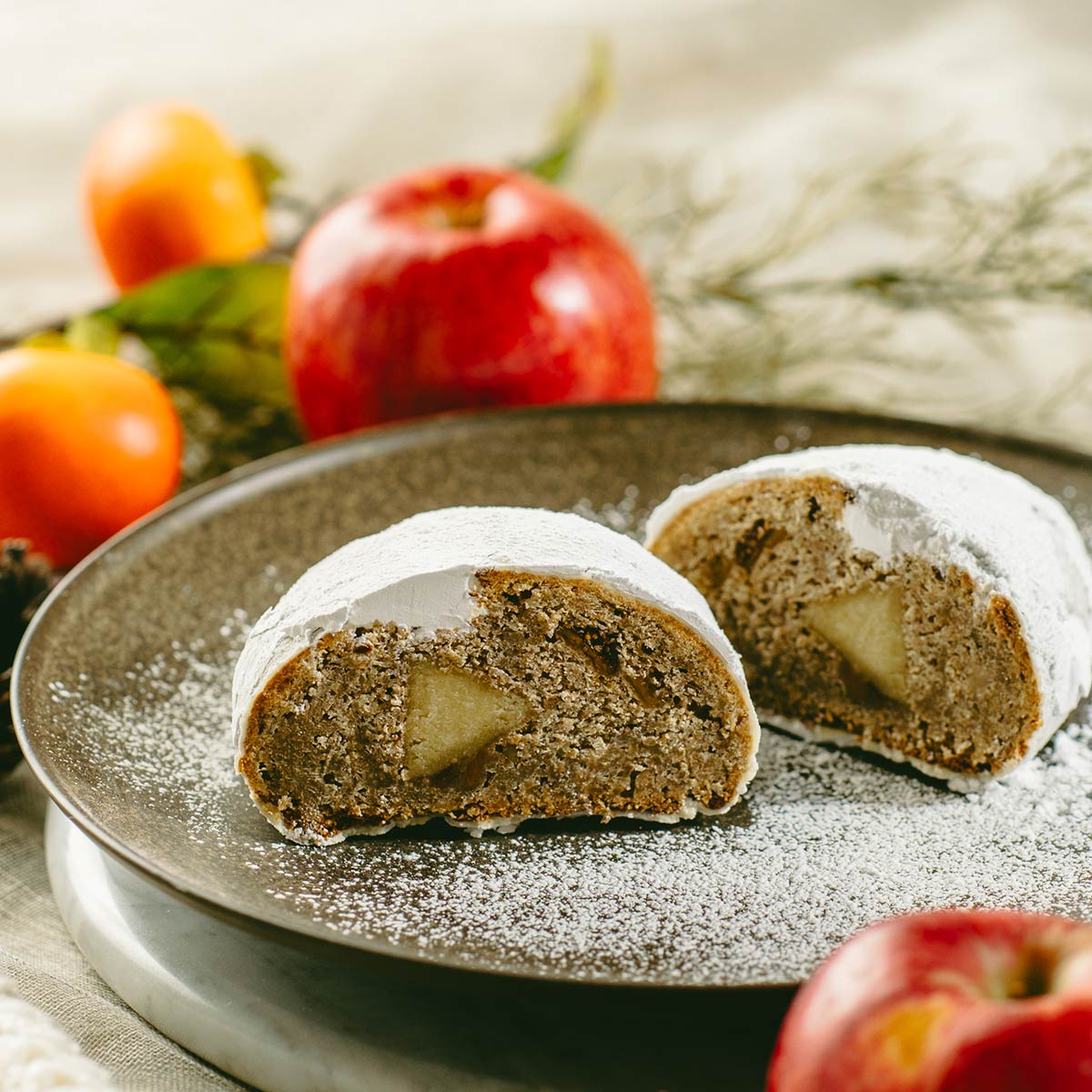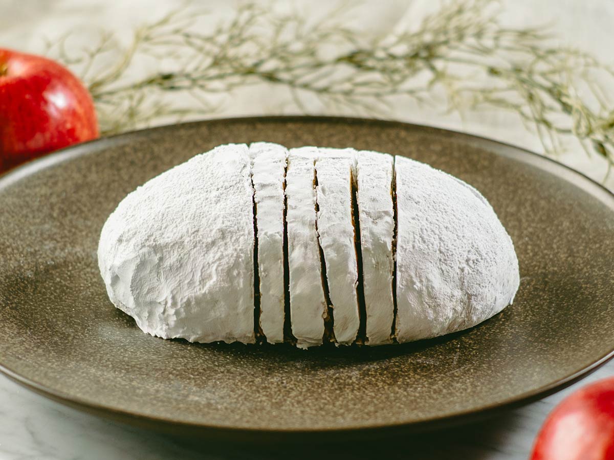 一般的な洋酒漬けフルーツを使ったシュトーレンとは異なり、Iwai Stollen は干し柿・りんご・いちじくなど、東北で昔から親しまれてきた和の素材を、洋酒に漬けず丁寧に加工し、組み合わせているのが特徴です。